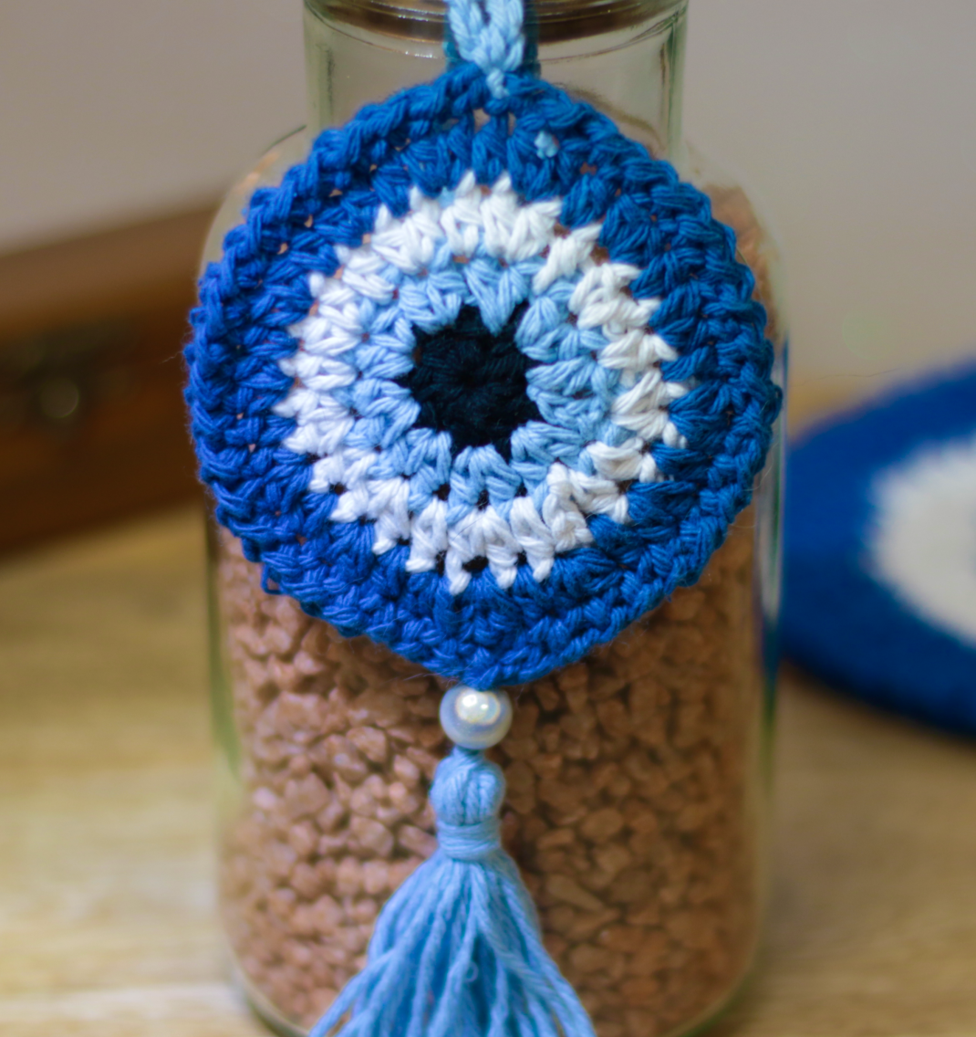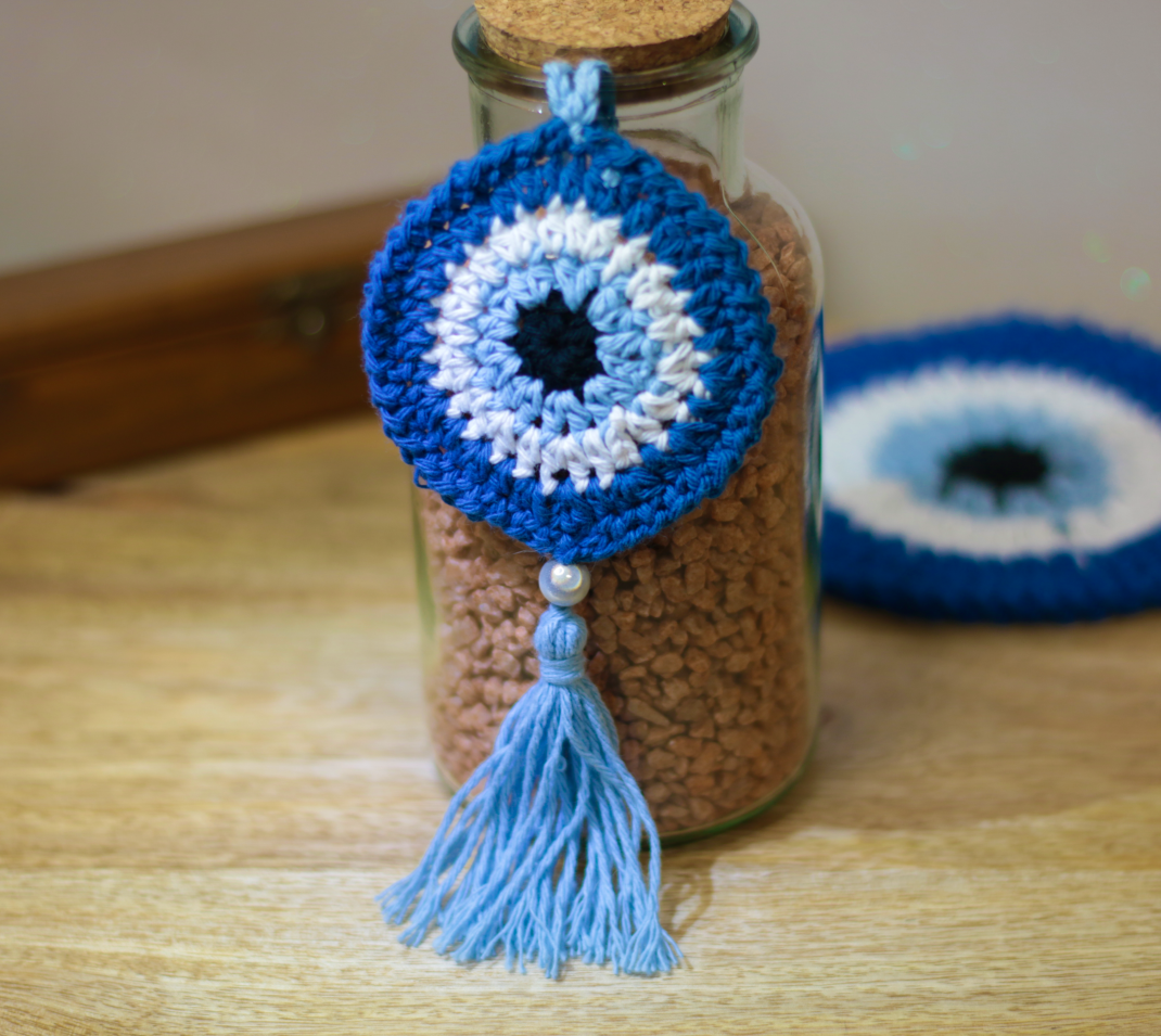 Traz proteção e boas energias para o teu espaço com este Olho Turco em Crochê, feito à mão com fios de alta qualidade e acabamento delicado.