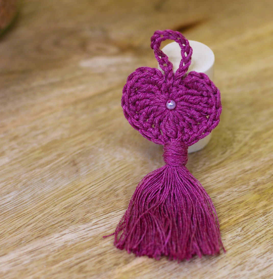 Este elegante Pendente em forma de Coração, feito à mão em crochê bordeaux, simboliza amor, proteção e energia positiva. ❤️✨