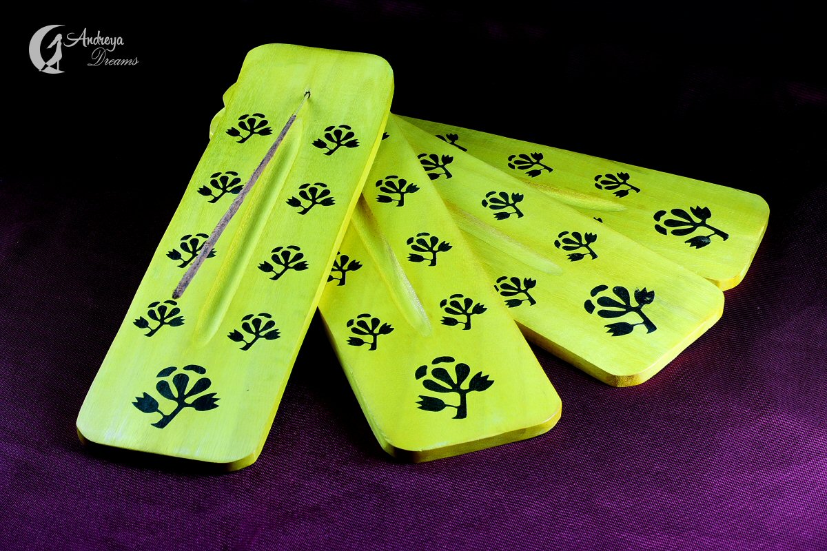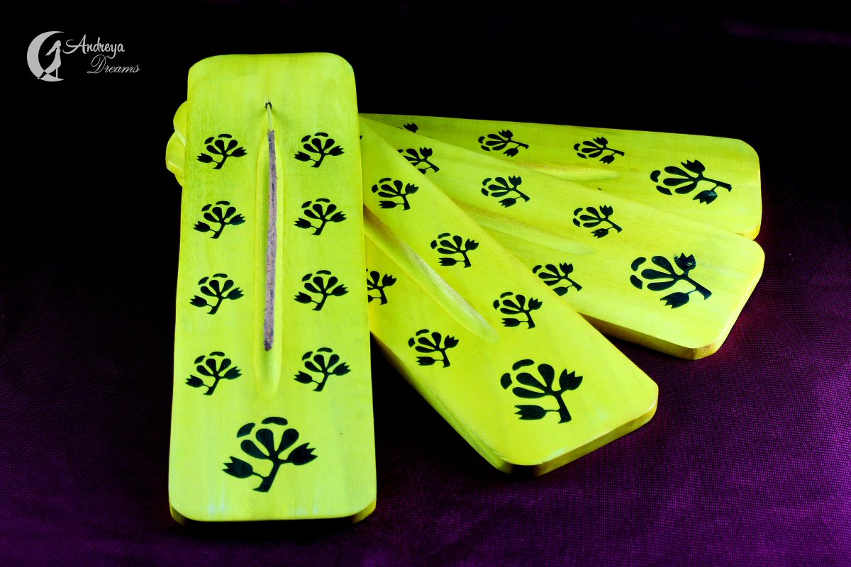 Este suporte de varetas de incenso é feito manualmente em madeira. Pintado de cor amarela e decorado motivos pretos.